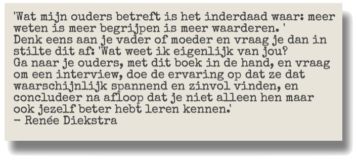 René Diekstra heeft een boek geschreven over dit onderwerp. Ik heb zelf het boek niet gelezen, en René heeft zijn ouders nooit geïnterviewd, want die waren al overleden toen hij op dit idee kwam. 😉 Toch denk ik dat het een handig boek kan zijn. Dat zegt mijn intuïtie. Als iemand het heeft gelezen, hoor ik graag een onderbouwde mening.
